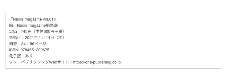 株式会社 ワン・パブリッシング(東京都台東区/代表取締役社長:廣瀬有二)は、2021年1月14日(木)に「Nadia magazine vol.01」(定価:本体680円+税)を発売いたします。