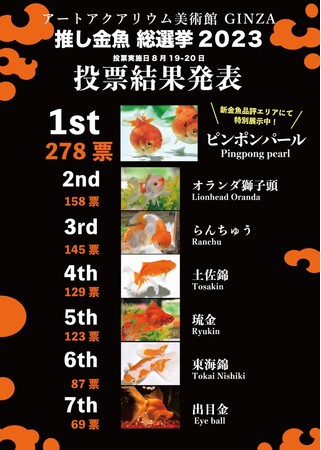 アートアクアリウム美術館 GINZA(所在地/銀座三越)は、8月19日、20日に実施した「推し金魚総選挙2023」の投票結果を発表いたします。ご投票いただいた皆様、誠にありがとうございました。