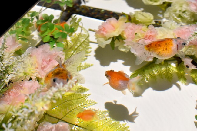 本日より「新金魚品評」では“ピンポンパール”が泳ぐ水槽内をピンクローズとホワイトローズが彩る豪華な装飾を施し展示いたします。