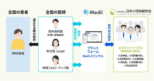本取り組みは、日本小児神経学会が公式に組成したエキスパートパネル「BRIDGE-NMD」※1への症例相談を、Mediiが運営する医師向け専門医相談サービス「Medii Eコンサル」を用いて実現したものです。本体制は、エレビジスの「適正使用ガイド」にも明記され、国内の高度医療における新たな安全管理の枠組みとなります。