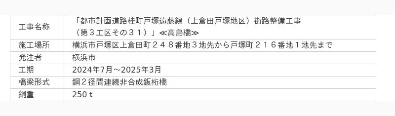 JFEエンジニアリング株式会社(社長:福田 一美、本社:東京都千代田区)は、橋梁工事の環境負荷低減の取り組みとして、JFEスチール株式会社(社長:広瀬 政之、本社:東京都千代田区)が提供する「グリーン鋼材"JGreeX(ジェイグリークス)"」を、横浜市発注の「都市計画道路桂町戸塚遠藤線(上倉田戸塚地区)街路整備工事(第3工区その31)」≪高島橋≫(以下、本工事)で採用します。