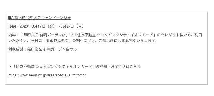 ※「無印良品 有明ガーデン店」で「住友不動産 ショッピングシティイオンカード」のクレジット払いご利用分が対象となります。AEON Pay、Apple Pay、おサイフケータイ・iDでのお支払いは対象外となります。※2023年5月ご請求明細にて10%割引いた金額でご請求させていただきます。※有明ガーデン専門店及び「ホテル ヴィラフォンテーヌ グランド 東京有明」「泉天空の湯 有明ガーデン」は対象外となります。※「住友不動産 ショッピングシティイオンカード」のプラスチックのクレジットカードのみが対象となります。