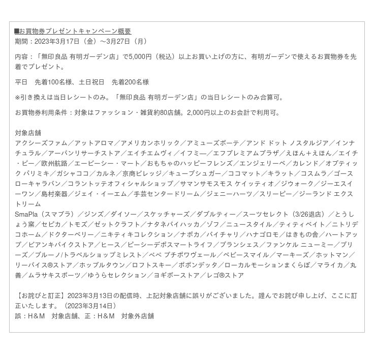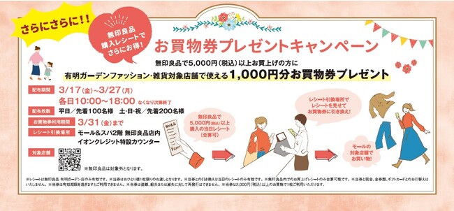 期間中「無印良品 有明ガーデン店」で5,000円(税込)以上お買い物すると、有明ガーデンで使えるお買物券がもらえるキャンペーンを同時開催いたします。