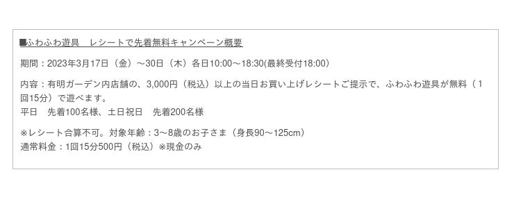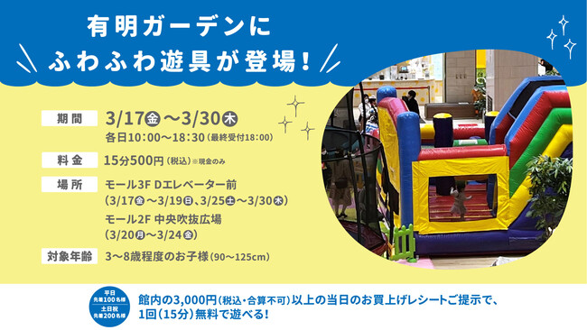 キッズも楽しめる新生活応援キャンペーン!有明ガーデンのお買い物レシートでふわふわ遊具が無料になるキャンペーンを開催いたします。