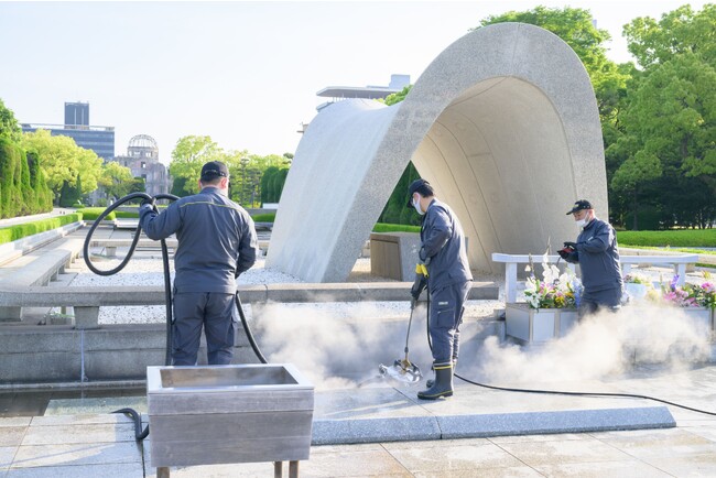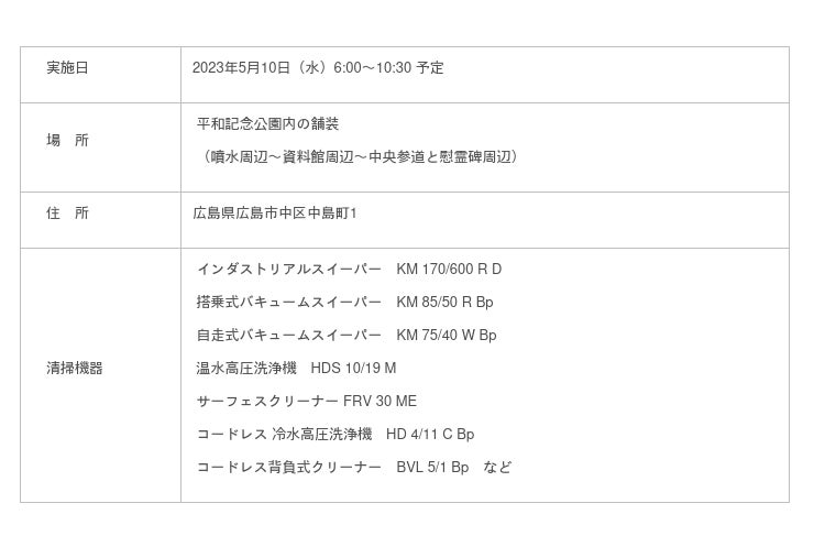 清掃機器の最大手メーカー、ドイツ・ケルヒャー社の日本法人、ケルヒャー ジャパン株式会社(本社:神奈川県横浜市港北区、代表取締役社長:マーク・ヴァン・インゲルゲム)は、2023年 5月10日(水)に、広島市の協力要請のもと、平和記念公園内の舗装清掃及び洗浄を行いました。