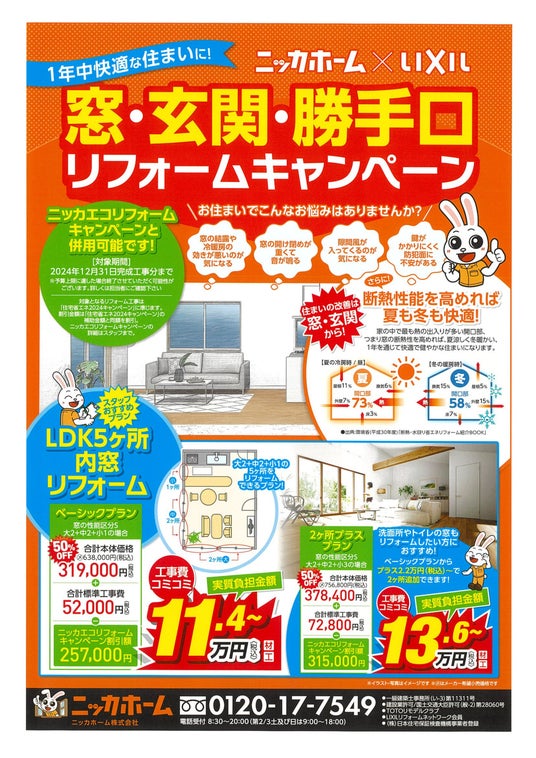 ニッカホームオリジナル【ニッカエコリフォームキャンペーン】を併せて利用して、お得に断熱リフォーム♪窓・玄関・勝手口のリフォームをご検討の方は、今がチャンスです!