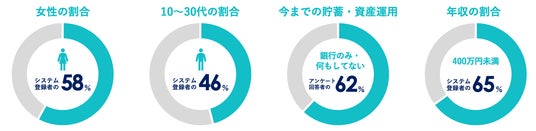 加入者の半数以上が女性、加入者の約半数が10~30代の若い世代。「投資初心者」が6割超、年収400万円未満の方が6割超。無理なく始められる資産形成手段を提供。
