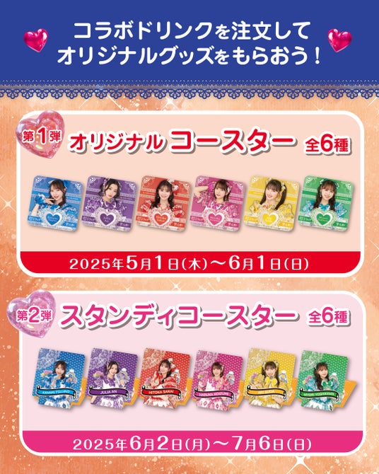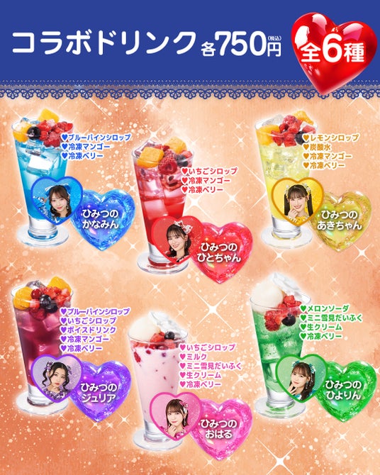 「超ときめき(ハート)宣伝部」のメンバー6名をイメージしたカラーのコラボドリンクです。注文特典としてコラボドリンクを1品ご注文につき、メンバー別ノベルティの中からランダムで1枚プレゼントします。