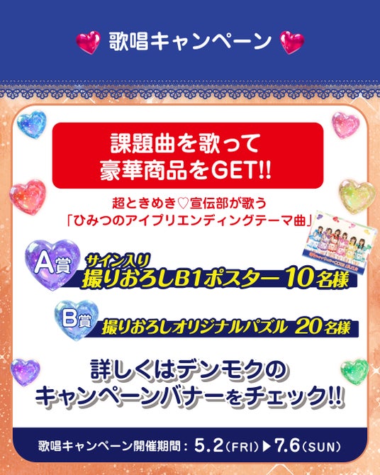 さらに、今回は「超ときめき(ハート)宣伝部」がエンディング主題歌を担当するテレビアニメ「ひみつのアイプリ」とも連動した企画となっており、「超ときめき(ハート)宣伝部」と「ひみつのアイプリ」が好きなファンの方はもちろん、ファミリーにもお楽しみいただける企画となっています。