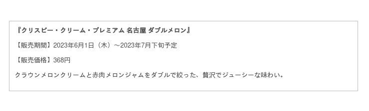 クリスピー・クリーム・ドーナツ・ジャパン株式会社(本社:東京都渋谷区、代表取締役社長:若月 貴子、以下:KKDJ)は、ジェイアール名古屋タカシマヤ店限定「クリスピー・クリーム・プレミアム 名古屋」の新商品として、『クリスピー・クリーム・プレミアム 名古屋 ダブルメロン』を2023年6月1日(木)より期間限定で販売します。また、以前販売しご好評いただいた『クリスピー・クリーム・プレミアム 名古屋 塩豆あんバター』も再登場し、同時販売します。
