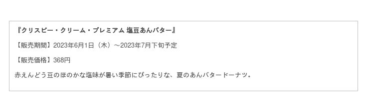 『クリスピー・クリーム・プレミアム 塩豆あんバター』は、ほくっとした食感の赤えんどう豆と、優しい甘さの小倉餡、芳醇な味わいの北海道産バターを贅沢に挟んだ“あんバタードーナツ”です。存在感のある赤えんどう豆から感じるほのかな塩味が、小倉餡の甘さを引き立て、暑い夏に食欲を誘う一品です。