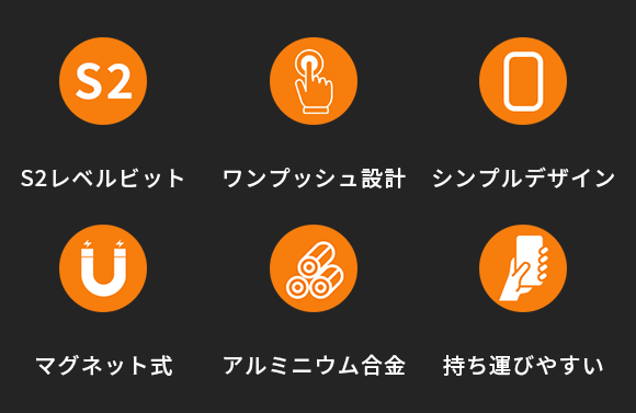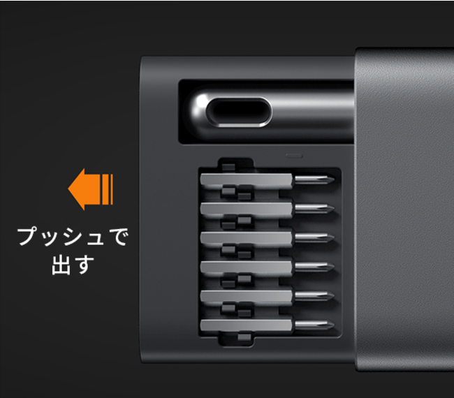 パソコンの分解から大工まで幅広く使える48種類のビットが収納ケースと共に付属しています。さらに、ビットの取り付けも着脱の便利なマグネット式を採用。ハンドルの先端に押し込むだけで装着完了。強力なマグネットのおかげで強く振ってもビットが落ちないので、スムーズに作業することが可能。