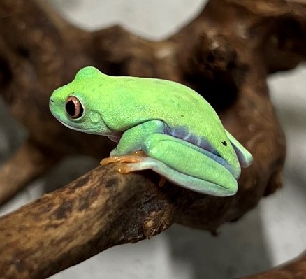 アカメアマガエルは、その名の通りに赤い目と、体側の青や黄色の鮮やかな体色が特徴的な樹上性のカエルです。