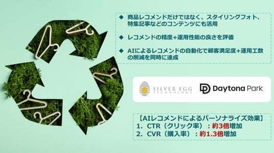 シルバーエッグ・テクノロジー株式会社(本社:大阪府吹田市、代表取締役社長&CEO:トーマス・フォーリー、証券コード 3961、以下 シルバーエッグ)は、同社が開発・提供するAI技術を用いたリアルタイム・レコメンドサービス「アイジェント・レコメンダー」を、2023年11月に株式会社デイトナ・インターナショナル(本社:東京都渋谷区、代表取締役:佐々木 聡、以下 デイトナ・インターナショナル)のファッションECサイト「Daytona Park(デイトナパーク)」(https://www.daytona-park.com/)に導入しました。導入後の評価により、AIレコメンドによってパーソナライズされた商品リンクは、パーソナライズされていないものに比べCTR(クリック率)が約3倍、CVR(購入率)が約1.3倍となることを確認しましたので、これを発表します。