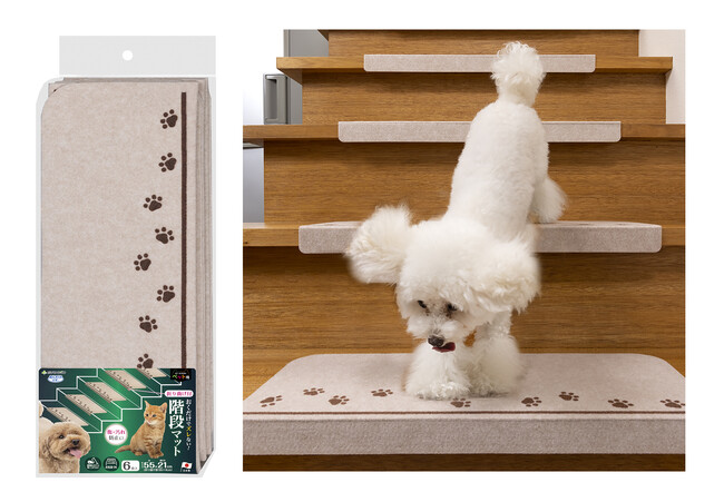 今回のイチオシ商品「おくだけ吸着階段マット 肉球」は、裏面吸着加工で付け外し簡単!肉球プリント柄部分はすべり止め加工で安心です。汚れたら洗濯機で洗えるのも嬉しいポイント♪