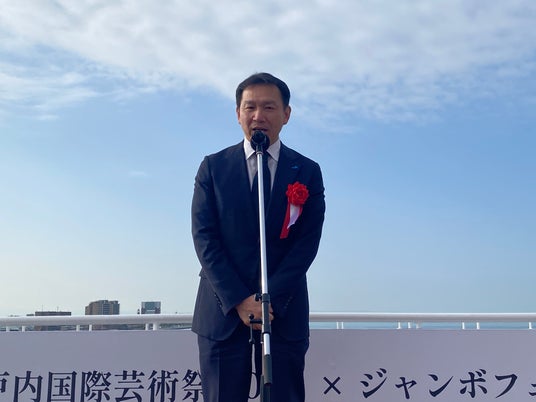 晴れ渡る大空と神戸の海を背景に現れた作品に、会場からも大きな拍手が沸き上がりました。