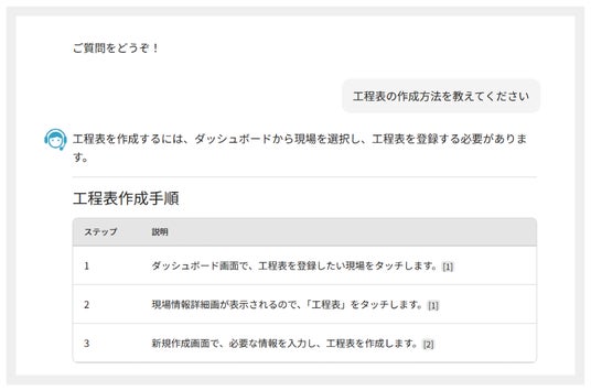そこで現場Plusは、使いやすさをさらに高めるため、アプリから簡単に、AIに質問できる仕組みを提供します。確認にかかる手間と待ち時間を減らし、作業を止めずに進められる環境を支援します。