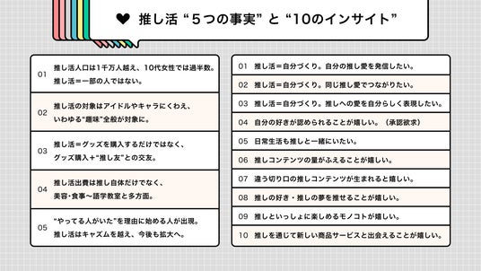このレポートは2024年4月の設立以降、推し活総研が公式note・講演会で発信した内容や実施してきた定量・定性調査の結果をもとに、推し活の現状と推し活をしている人の気持ちをそれぞれ“5つの事実”と“10のインサイト”としてまとめたものです。