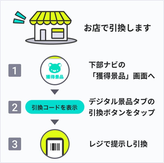 ※スマートフォン上に表示されるバーコードを店舗で提示することで商品と交換ができます。パソコンで表示したもの、印刷したものでの交換はできません。