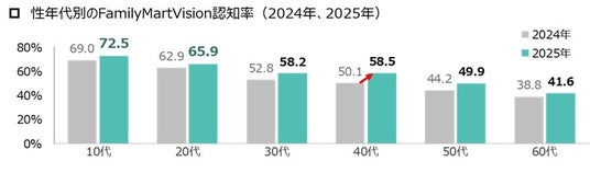 認知率を年代別に見ると、これまでの調査と同様に10代、20代の若年層において高い数値を示しています。また今回の調査では、30代で6pt, 40代で8ptが上昇し、ミドル層での認知も広がっていることがわかりました。これは、2025年に東京を中心とした都市部へのFamilyMartVision設置を進めたことによる、オフィス近隣での接触機会の増加が主な理由と考えられます。実際に関東地方の認知率をみると、2024年の50.6%から57.3%に上昇していることからも、都市部への設置による接触機会増加の効果が表れていると言えます。