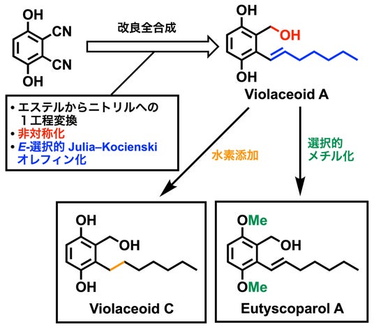 こうした研究の進展を受け、今回、本研究グループは、ユーチスコパロールAとビオールアセオイドCの全合成を、新たに独立した研究成果として達成しました。