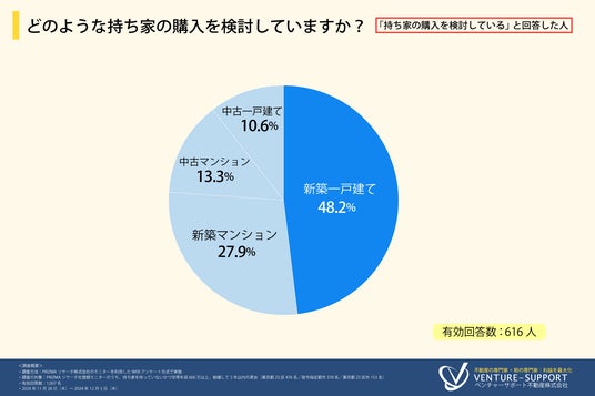 持ち家の購入を検討していると回答した人に、「どのような持ち家の購入を検討していますか?」と質問したところ、「新築一戸建て(48.2%)」と回答した人が最も多く、次いで「新築マンション(27.9%)」「中古マンション(13.3%)」「中古一戸建て(10.6%)」と続いた。