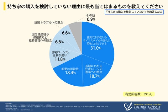 持ち家の購入を検討していないと回答した人に、「持ち家の購入を検討していない理由に最も当てはまるものを教えてください」と質問したところ、「賃貸の方が収入やライフスタイルの変化に柔軟に対応できる(31.0%)」と回答した人が最も多く、次いで「長期にわたる住宅ローンの返済への懸念(18.7%)」「転勤の可能性(18.4%)」「住宅ローンの金利が高い(11.8%)」「固定資産税や修繕費など維持管理への懸念(6.6%)」「近隣トラブルへの懸念(6.6%)」「その他(6.9%)」という回答結果となった。