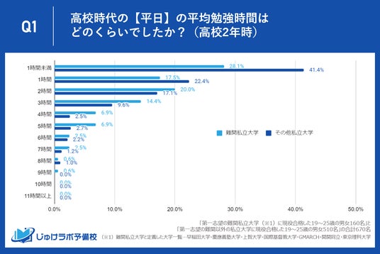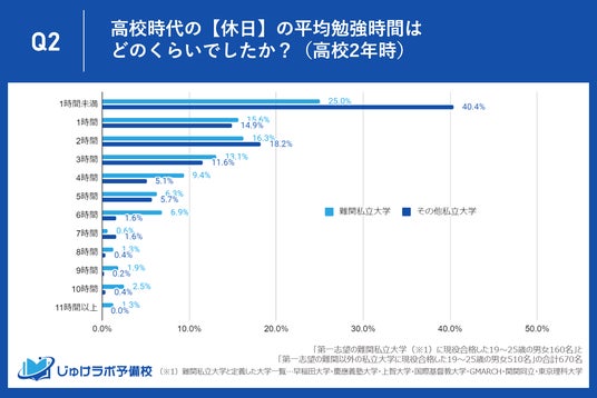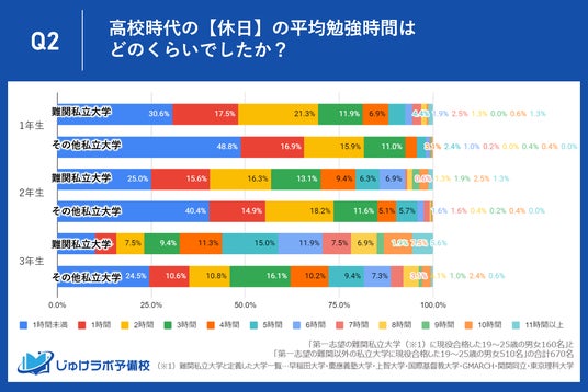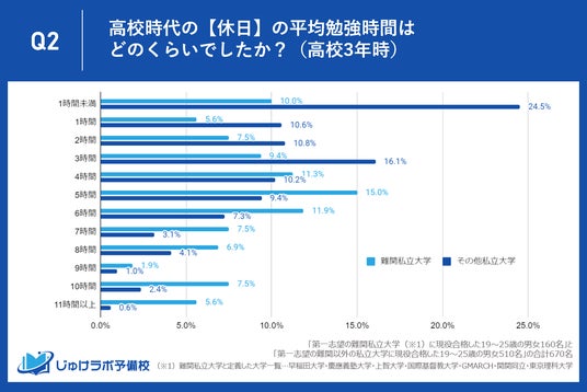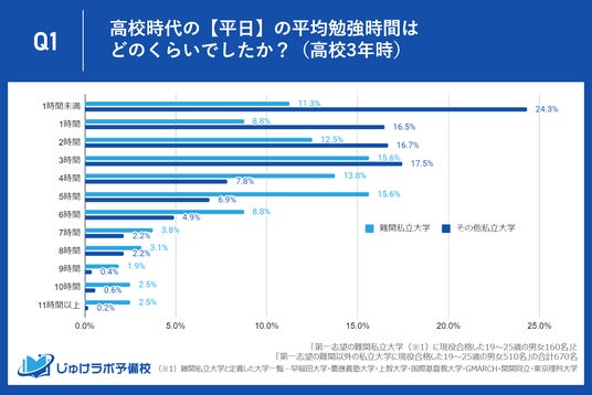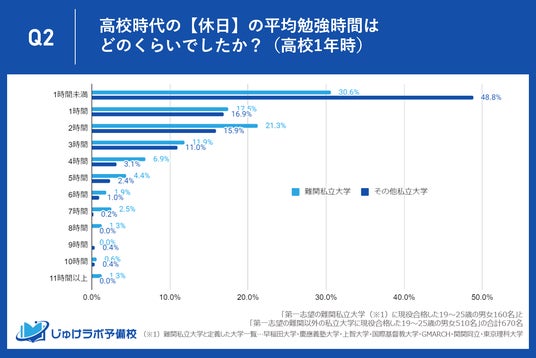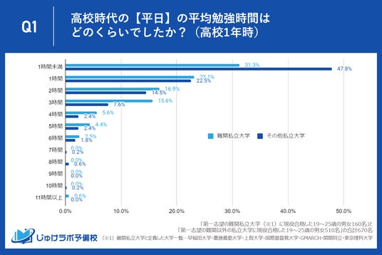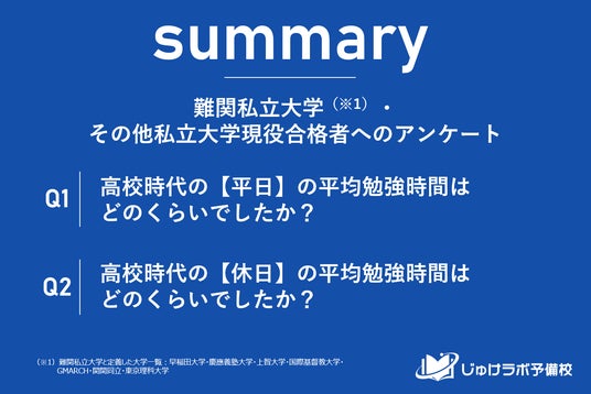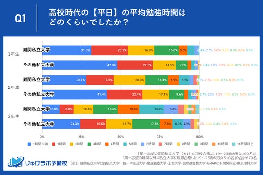 じゅけラボ予備校(所在地:大阪市北区、代表取締役:後藤智則)は、第一志望の難関私立大学(※1)に現役合格した160名とそれ以外の第一志望の私立大学に現役合格した510名の合計670名を対象に、勉強時間に関する調査を実施しました。