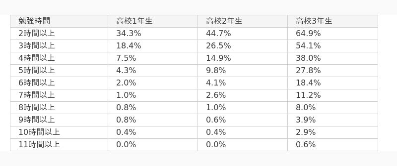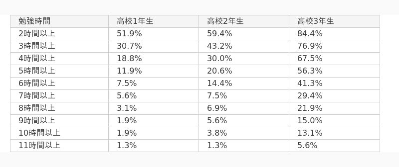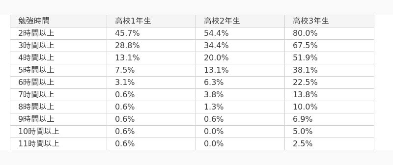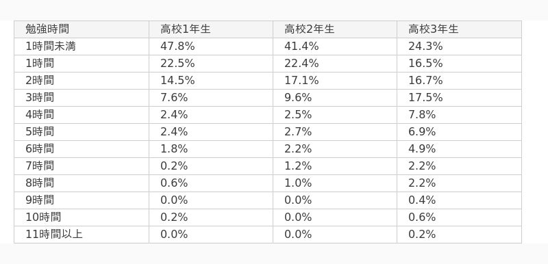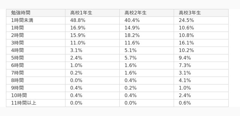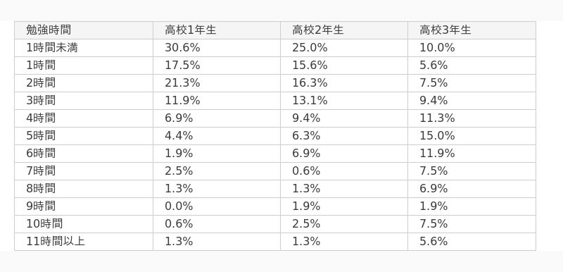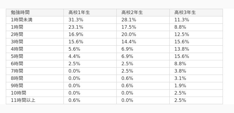 「1時間未満」の割合が大幅に減少し、10%にまで下がっており、これは、高校最後の年となり受験が迫る中で、多くの人がより長い時間を勉強に割くようになったことを示しています。