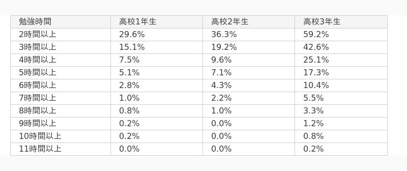 「2時間以上」の割合が59.4%に増加し、勉強時間を増やす人が増えています。「3時間以上」は43.2%、「5時間以上」は20.6%と、高校2年生になるとより多くの時間を勉強に割く人が増える傾向が見られます。