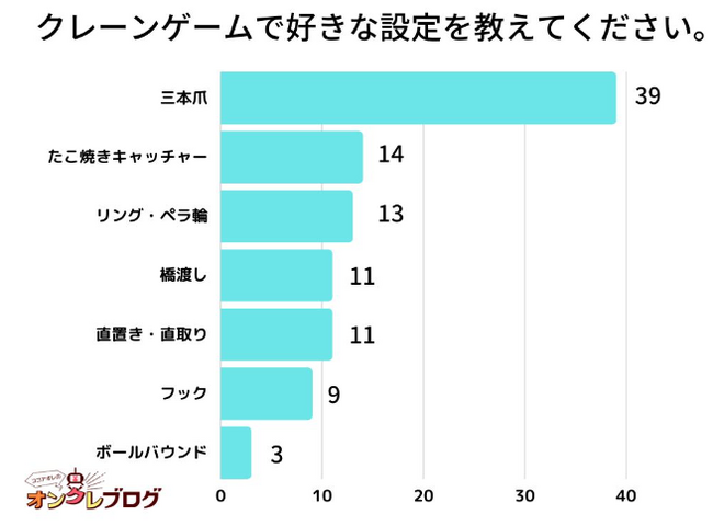 「クレーンゲームで好きな設定を教えてください。」アンケート調査した結果、1位は『三本爪』でした。
