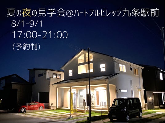 暑い陽がかげる頃から始まる特別な見学会。駅から2分というマンション並み好立地の大規模分譲地「ハートフルビレッジ九条駅前」で、夜の涼しさを感じながらライトアップされたモデルハウスをご覧ください。8月1日から9月1日までの期間限定で、通常の見学時間を夜21時まで延長し、静かで心地良い環境でのご見学が可能です。