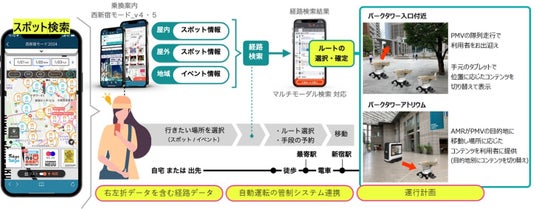 ジョルダン株式会社(以下、ジョルダン。本社:東京都新宿区、代表取締役社長:佐藤 俊和)と三菱電機株式会社(以下、三菱電機。本社:東京都千代田区、執行役社長:漆間 啓)は、東京都が設立した「西新宿先端サービス実装・産官学コンソーシアム」における「先端サービス実装分科会プロジェクト」の一環として、2024年3月2日~3日に「新宿パークタワー・アトリウム及び噴水広場」(東京都新宿区)にて、共同実証実験を実施します。前回2023年3月に実施した実証実験(※1)から新たにサービスを追加し、1.ジョルダン乗換案内の経路検索データを活用したパーソナルモビリティビークル(以下、PMV)の屋内外シームレスなラストワンマイル移動サービス、2.PMV及び自律走行ロボット(以下、AMR)の位置情報に応じたリアルタイムコンテンツを提供予定です。