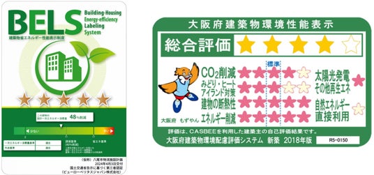 本施設は、環境負荷低減の取り組みの一環として、全館LED照明などの高効率機器の導入などから、基準一次エネルギー消費量を48%削減することにより、BELSの5つ星を取得しています。また、それらの取り組みを含めて建築物の環境性能が総合的に評価されるCASBEE大阪みらいのAランク(総合評価4つ星)を取得しています。