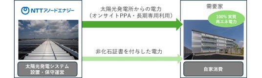 ※3:再エネ指定の非化石証書を組み合わせて調達することにより、実質的に100%再エネを実現します。具体的には、太陽光発電所の電力はオンサイトPPAを活用し対象ビルに供給され、太陽光発電所の電力で不足する分は、補給電力として卸電力取引所等の電力を供給し、この補給電力に再エネ指定の非化石証書を付与します。補給電力供給は、NTTアノードエナジーグループの株式会社エネット(本社︓東京都港区、代表取締役社長 谷口 裕昭、小売電気事業者登録番号:A0009)が行い、NTTアノードエナジーは取次店としてサービスを提供します。