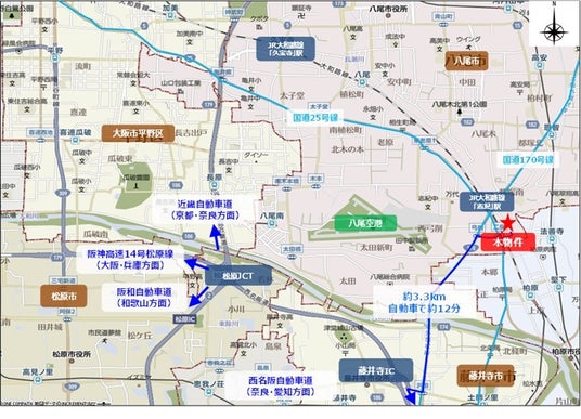 本施設は、西名阪自動車道「藤井寺IC」まで約3.3kmと、大阪市都心部および広域の双方への配送が可能な物流適地に位置しています。また、JR大和路線「志紀」駅徒歩8分と、通勤利便性にも優れており、就業者の人材確保においても優位性の高い場所となります。
