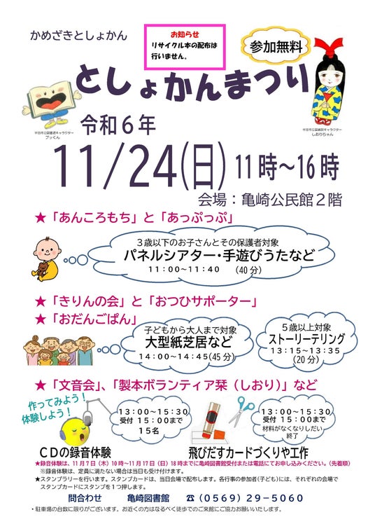 地域活動の拠点となっている亀崎公民館を会場に、小さなお子さんから大人までが楽しめるおまつりを開催します。たくさんの人に、本やおはなしの楽しさを知っていただき、老若男女問わず、読書習慣を生活に取り入れていただきたいと思います。