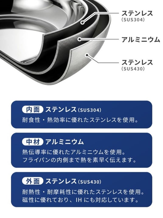 ●材質:本体/アルミクラッド三層鋼(ステンレス(18-0)、アルミ、ステンレス(18-8))、取っ手/18-0ステンレス