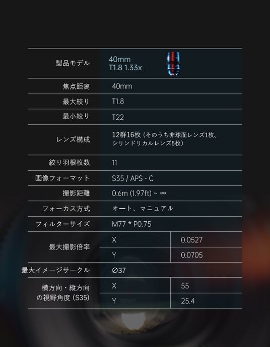 「40mm T1.8 S35 1.33x アナモルフィックレンズ」は、2024年5月28日にSIRUIがマイクロフォーサーズシステム規格の賛同企業となって以来、初めて発表されたオートフォーカス搭載のアナモルフィックレンズです。