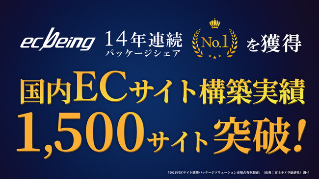 株式会社ecbeing(イーシービーイング 本社:東京都渋谷区、代表取締役社長:林 雅也、以下ecbeing)は、2021年度において国内ECサイト構築実績1,500サイトを突破し、富士キメラ総研社の発行する富士マーケティング・レポートによる【 ECサイト構築パッケージソリューション市場占有率調査 】において、14年連続シェアNo.1を獲得しました。