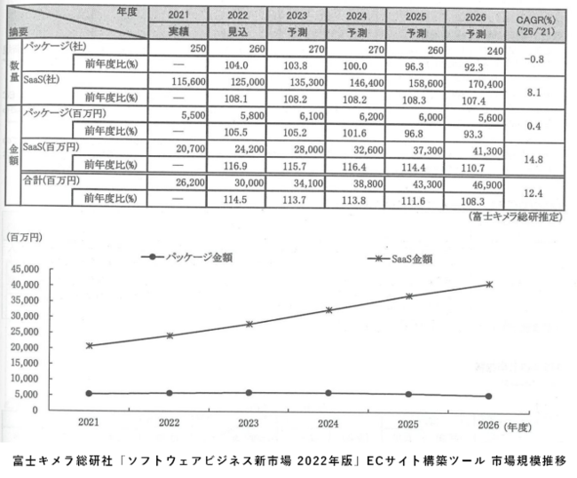 2021年度のECサイト構築ソリューション市場規模は合計262億円となり、5年後の2026年には469億円に達することが予測されております。