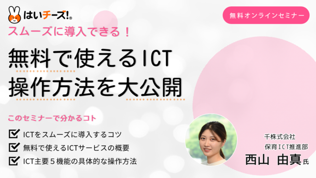 ICTで保育士の働き方改革や保育業界のDXを推進し、子どもの幸せをつくることを目指す千株式会社(本社:東京都千代田区、代表取締役社長 千葉伸明、以下 当社)は、保育ICTの活用を検討する先生や自治体の方へ向けて、無料オンラインセミナー「スムーズに導入できる!無料で使えるICT 操作方法を大公開」を開催いたします。