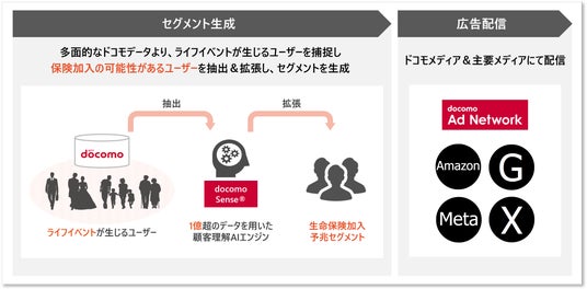 今回提供を開始した「保険加入予兆ターゲティング」は、1億超(※1)のドコモユーザーから保険に加入する可能性が高いユーザーを抽出してセグメント化し、広告配信に活用できるソリューションです。ドコモが保有する契約者情報やアプリインストールログ、アンケートデータ等の膨大なデータをもとに、ドコモの独自AIエンジン「docomo Sense(R)」の拡張機能を活用することで、就職や結婚、出産、住宅購入、定年退職など様々なライフイベントを予測し、保険に加入する可能性が高いタイミングを捉え、セグメントを作成します。このソリューションにより、生命保険や医療保険など各種保険に加入する可能性が高いと予測できるユーザーに対して広告配信を行うことで、効率かつ効果的に良質なリードを獲得することを目指します。