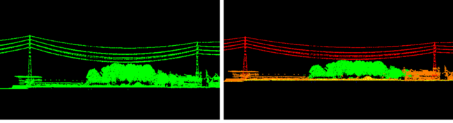 朝日航洋は、空間情報事業の社会インフラ点検分野において、ヘリコプターや計測車両を使用し、送電線などの電力設備を撮影・計測し解析を行っています。可視光のカメラだけではなくレーザ計測を行うことで、設備と植生の離隔や設置状況の異常の有無を立体的に確認しています。取得した3D点群データはあらゆる対象物が点の集まりで表されており、どの点がどの対象物を示しているのかは、これまでは全て人が目視で確認し、手作業で仕分け(フィルタリング作業)をしていました。その量は年間約5,000km、約1,700人日もの作業工数が発生します。膨大な作業負荷に加えて、目視によるフィルタリング作業では、作業者による判定のバラつきが生じることが課題でした。