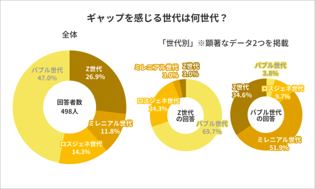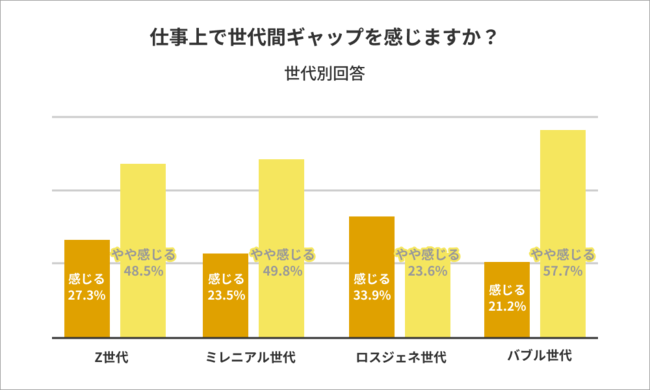 またこれを世代別で見ていくと、特に顕著だったのがZ世代とバブル世代の回答で、Z世代の69.7%がバブル世代にギャップを感じているという回答に対して、バブル世代がZ世代に対して感じるギャップは34.6%の回答で双方に感じるギャップの差が見られました。