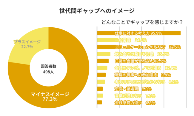世代間のギャップについてどのようなイメージを持っているかを聞くと、全体の77.3%が「マイナスイメージ」と回答し、プラスイメージは22.7%の回答結果でした。