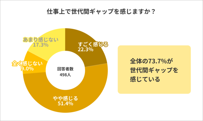 仕事上で世代間ギャップを感じるかについて、「すごく感じる」22.3%と「やや感じる」51.4%を合算した73.7%が世代間でギャップを感じると回答しました。「全く感じない」は9.0%で「あまり感じない」は17.3%の回答でした。またこれを世代別で見ていくと、バブル世代の回答で”世代間ギャップを感じる派”の回答が78.4%で最多になりました。ここで特に顕著だったのは感じる派の世代別回答割合で、他世代が70%超のところ、ロスジェネ世代のみ57.5%になり、ロスジェネ世代が最も世代間ギャップを感じていない回答結果になりました。