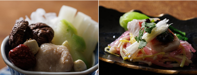 さつま若しゃも・冬瓜・フカヒレ・白きくらげを、中国漢方に由来するクコの実、干し椎茸、蓮の実、生姜、なつめなどを使用し、じっくりと蒸しあげたスープです。