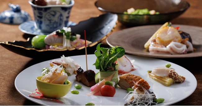 広東料理をベースとしたヌーベルシノワの懐石料理コースで魅了する「唐紅花」、オマール海老の鉄板焼きなど、厳選素材を活かした美食を提案する鉄板フレンチの「蒔絵」のコラボレーション料理をご案内いたします。
