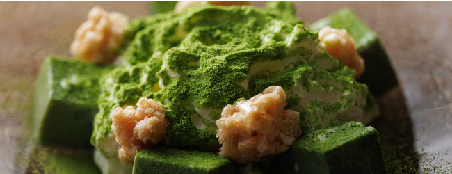 ○雷おこしのエスプーマ 抹茶のジュレと赤い果実